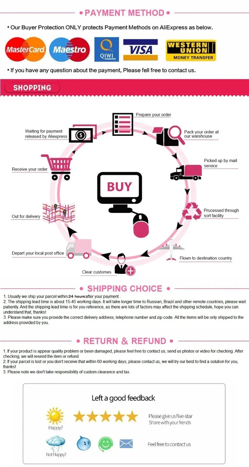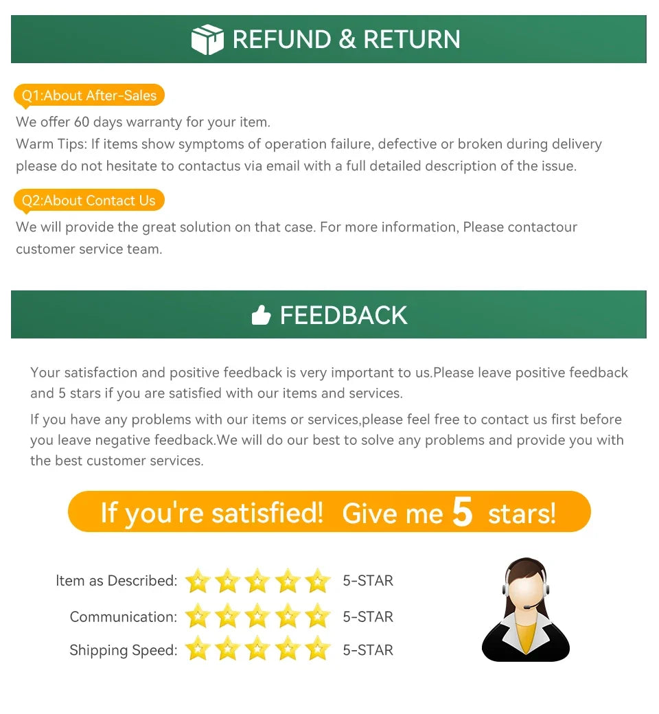 1) Your satisfaction and positive feedback are very important to us. If you are satisfied with our products and services, please leave positive feedback and 5 stars.